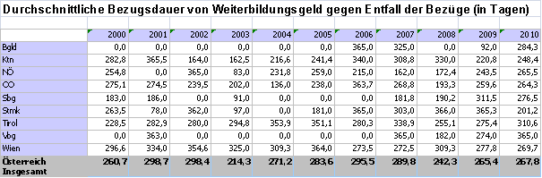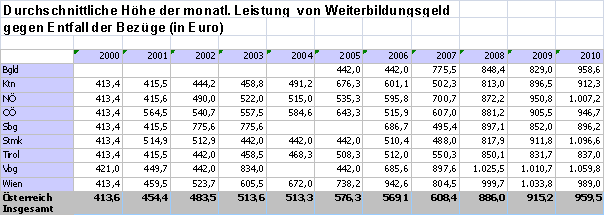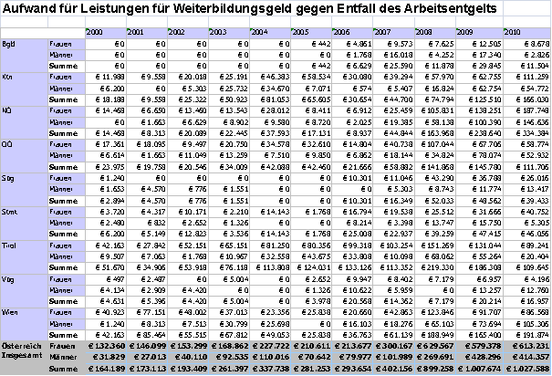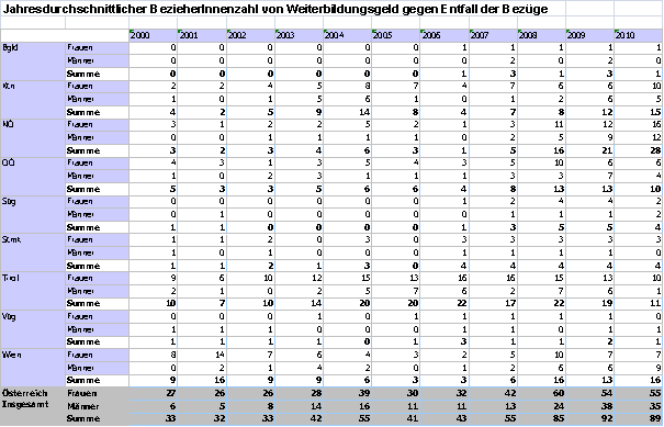 EDV-erfasste Daten zum Weiterbildungsgeld liegen ab dem Jahr 2000 vor. Die jahresdurchschnittliche Zahl an Bezieher/innen nach Geschlecht, Bundesland und Jahr sind in folgender Tabelle angeführt: