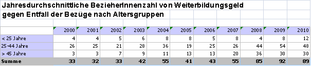 Den aggregierten Ausgaben für Leistungen zum Weiterbildungsgeld geg. Entfall des Arbeitsentgeltes im Zeitraum 2000 bis 2010 von insgesamt 5,04 Mio. Euro stehen Leistungseinsparungen für Ersatzkräfte von 4,97 Mio. Euro gegenüber. Über die gesamten 11 Jahre des Betrachtungszeitraums haben damit die Nettokosten 72.300 Euro betragen, im Jahresdurchschnitt waren dies 6.570 Euro. Weitere Leistungseinsparungen, die auf Grund der reduzierten Verfestigung von Arbeitslosigkeit bei den Ersatzkräften eintreten, sind quantitativ kaum abzuschätzen und daher hier nicht eingerechnet.