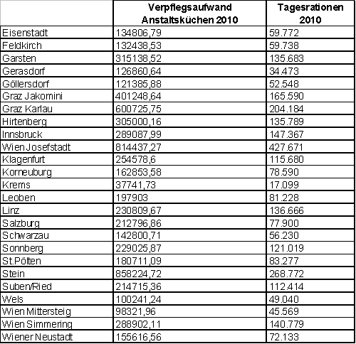 Im Jahr 2010 wurden insgesamt 2,879.211 Tagesverpflegsportionen in den Anstaltsküchen der Justizanstalten (inkl. Außenstellen) zubereitet und ausgegeben, wofür Materialkosten (Lebensmittel) von 6,606.373,23 Euro entstanden sind. Im Detail wird auf die nachstehende Tabelle hingewiesen; eine monatsweise Kostenaufstellung ist mangels periodenkonformer Verbuchung nicht möglich (die Werte der JA Krems beziehen sich datenbedingt auf die letzten drei Quartale des Jahres):