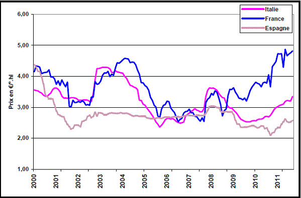 Aus der von der Europäischen Kommission erstellten langfristigen Graphik über die Preisentwicklung der international mengenmäßig bedeutendsten Kategorie des roten Tafelweines (einschl. Roséwein) ist der Preisverlauf sichtbar: Durch die mit der Reform der europäischen Weinmarktordnung 2008 stark zurück gefahrenen Destillationsaktionen zeigten vor allem die Länder Italien und Spanien (welche in der Vergangenheit sehr stark von den EU-Destillationsaktionen Gebrauch machten) 2009 noch eine rückläufige Preisentwicklung, die sich 2010 jedoch stabilisiert hat und gegen Jahresende 2010 bereits eine aufsteigende Tendenz zeigt. Frankreich, das weniger von Destillationsaktionen Gebrauch gemacht hat, zeigt seit der Reform eine kontinuierliche Aufwärtsentwicklung der Preise.