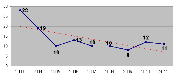 Der elektronischen Häftlingsverwaltung sind freigängerspezifische Daten erst ab dem Jahr 2003 vollständig zu entnehmen. Seither hat sich die Zahl der Nichtrückkehrer vom Freigang mit fallender Tendenz wie folgt entwickelt: