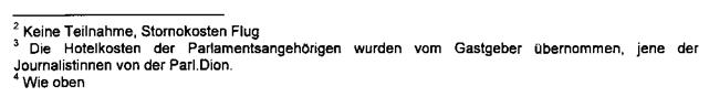 Die in der nachfolgenden Kostenaufstellung innerhalb einzelner Termine häufig unterschiedlich hohen Beträge der jeweiligen TeilnehmerInnen erklären sich hauptsächlich durch zeitlich versetzte Buchungen auf Grund individueller Nominierungen seitens der Fraktionen, aber auch durch unterschiedliche Startflughäfen im Inland und in der Folge unterschiedlicher Routings und Umsteigeflughäfen, durch Verknüpfung von Auslandsdienstreisen, Umbuchungen bzw. ob der Anspruch auf Reisegebühren geltend gemacht wurde.