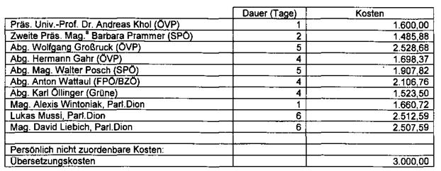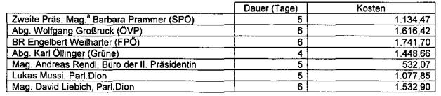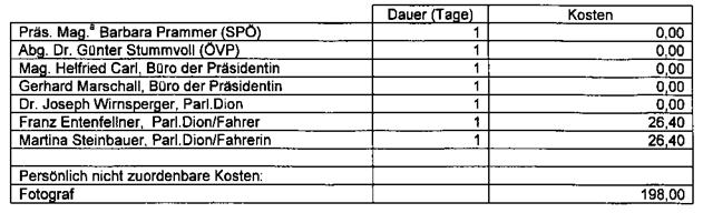 Im Rahmen dieser Dienstreise hat mein Büroleiter den offiziellen Reisezeitraum, 5.-12.2.2011, um einen Tag, also bis zum 13.2.2011, verlängert und sämtliche hiefür anfallenden Mehrkosten privat übernommen. Dem österreichischen Parlament sind in diesem Zusammenhang keinerlei Mehrkosten entstanden.