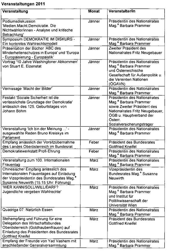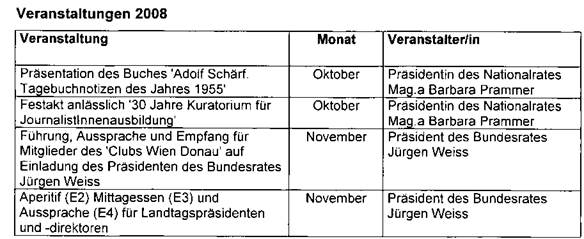 Das Konzept zur Implementierung einer Kosten- und Leistungsrechnung (KLR) in der Parlamentsdirektion wurde bereits am 6. Juni 2011 mit GZ. 02000.0066/3-A1.2a/2011 sowohl dem Zweiten und Dritten Präsidenten als auch dem Präsidenten des Bundesrates und den Klubobleuten zur Kenntnis gebracht. Dieses hält unter Punkt 2.4 Kostenträger im Hinblick auf das Veranstaltungswesen folgendes fest: „Der derzeit vorliegende Leistungskatalog beschreitet einen Mittelweg in der Abwägung zwischen Detaillierungsgrad (Transparenz) und - mit Rücksicht auf die im Vergleich zum Gesamtbudget geringen Ermessensausgaben der Parlamentsdirektion - vertretbarem Verwaltungsaufwand. Er gibt wieder, nach welchen Gesichtspunkten ausgewertet werden kann. So sind die Kosten für die Veranstaltungen des Parlaments im Bereich Öffentlichkeitsarbeit ersichtlich, nicht jedoch die Kosten einzelner Veranstaltungen.“
