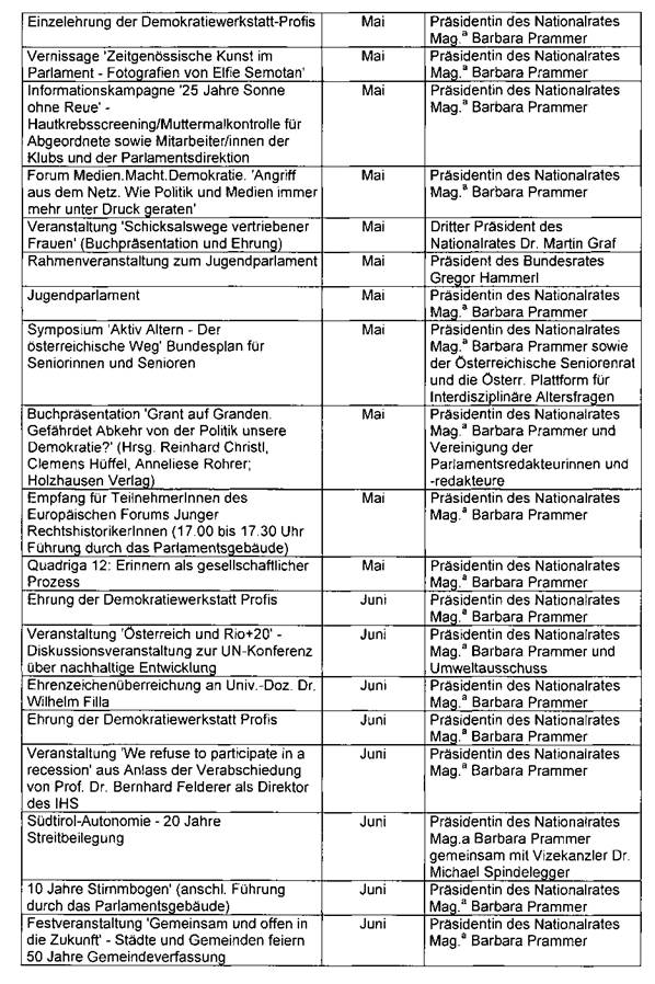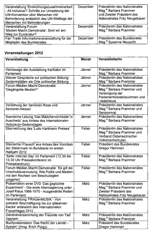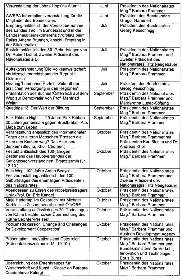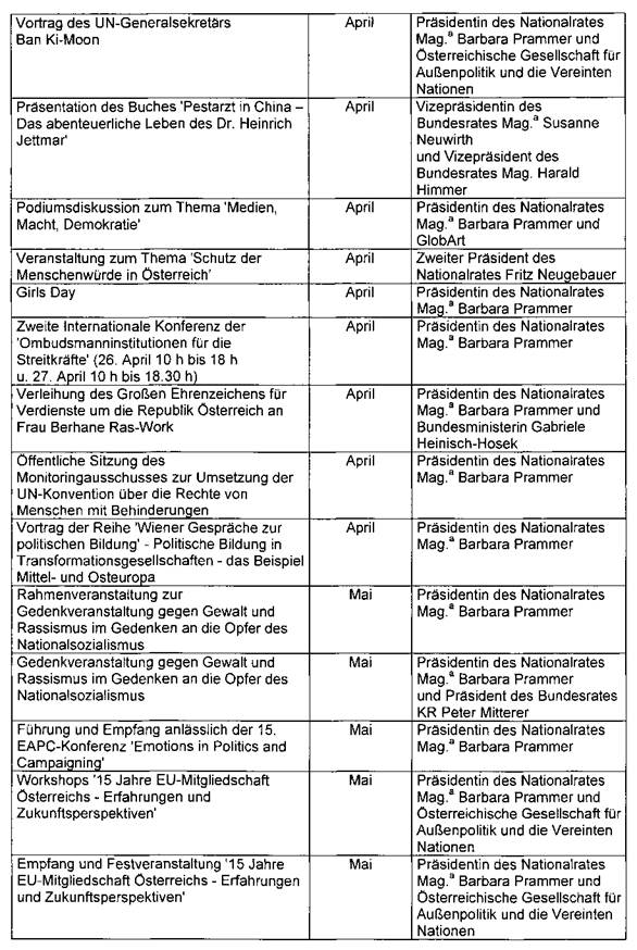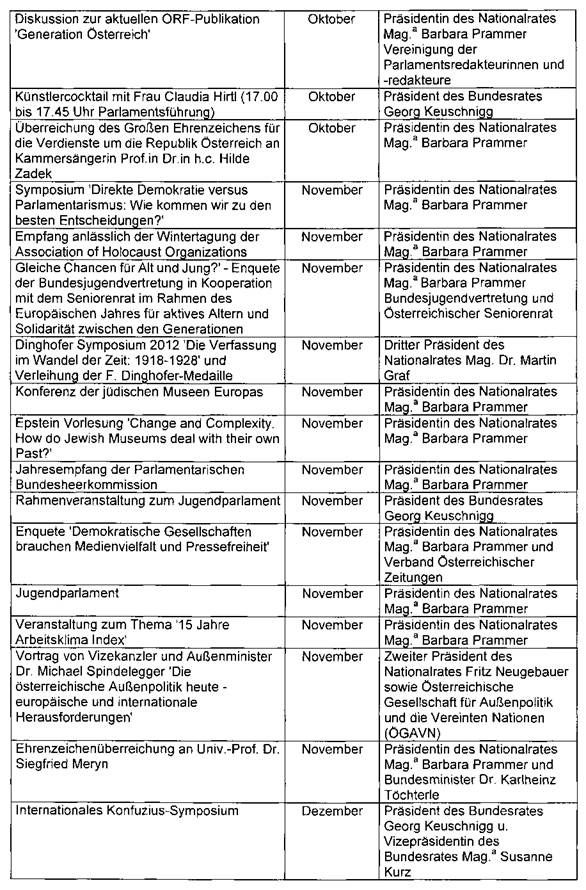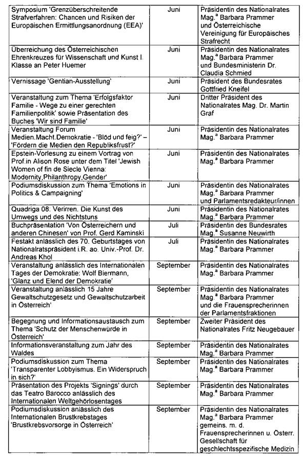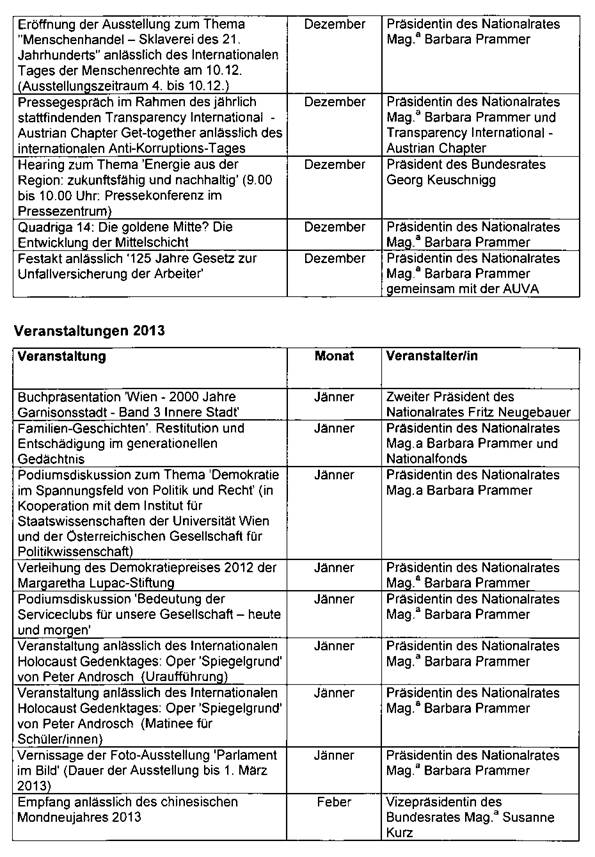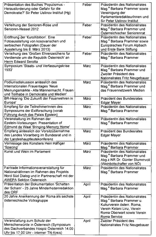 Die nachfolgende Auflistung gibt einen genauen Überblick über die Veranstaltungen der laufenden XXIV. Gesetzgebungsperiode. In der Spalte "Veranstalter/in" ist exakt angeführt, welche/r Präsident/in des Nationalrates, welcher Präsident bzw. Vizepräsident/in des Bundesrates als Gastgeber fungierten. Weiters sind der Tabelle sämtliche Kooperationspartner zu entnehmen. Ich weise an dieser Stelle darauf hin, dass diese Daten im Intranet des Parlaments abgebildet und jederzeit einsehbar sind.