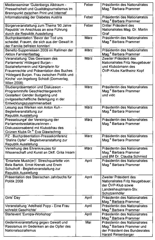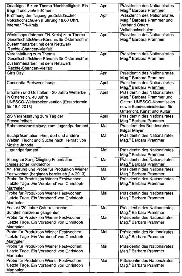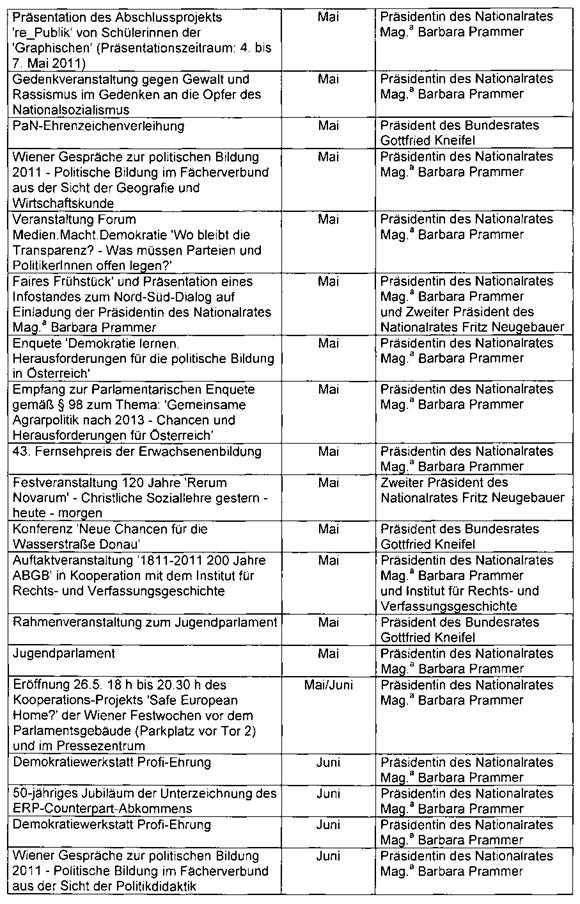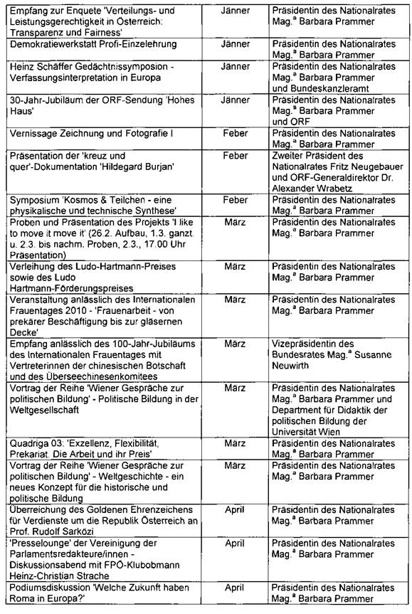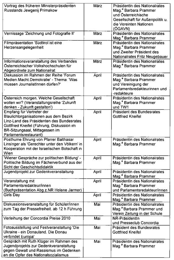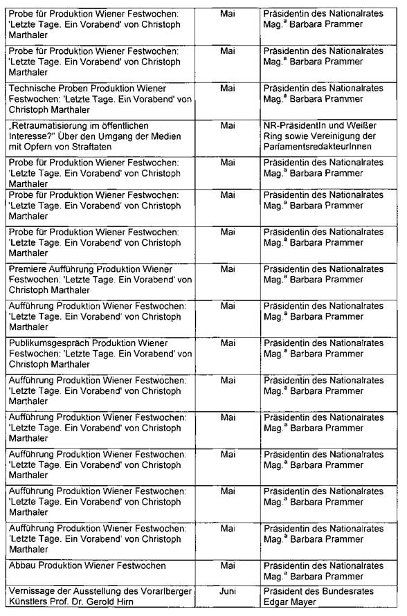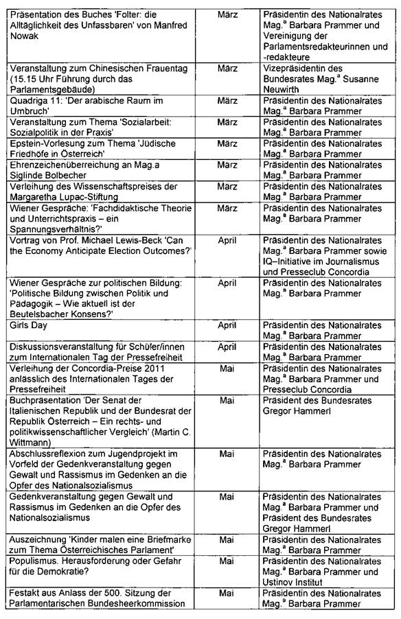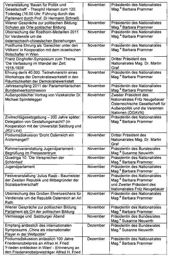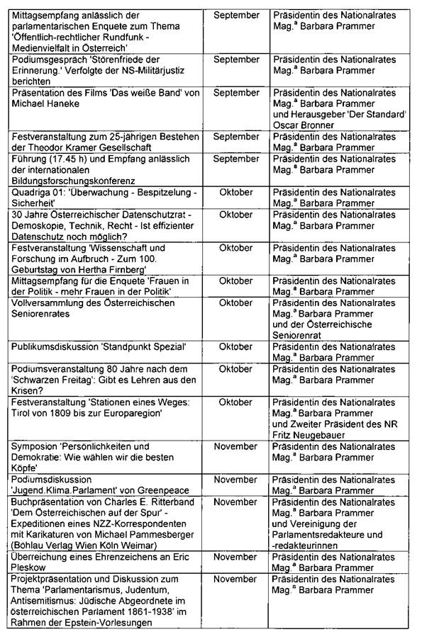 Die nachfolgende Auflistung gibt einen genauen Überblick über die Veranstaltungen der laufenden XXIV. Gesetzgebungsperiode. In der Spalte "Veranstalter/in" ist exakt angeführt, welche/r Präsident/in des Nationalrates, welcher Präsident bzw. Vizepräsident/in des Bundesrates als Gastgeber fungierten. Weiters sind der Tabelle sämtliche Kooperationspartner zu entnehmen. Ich weise an dieser Stelle darauf hin, dass diese Daten im Intranet des Parlaments abgebildet und jederzeit einsehbar sind.