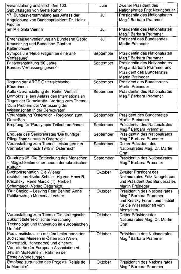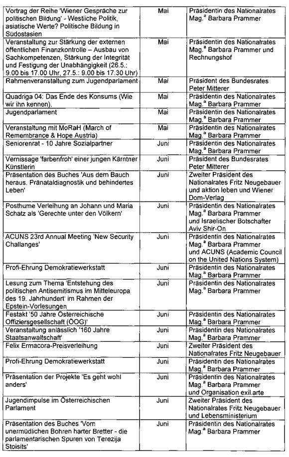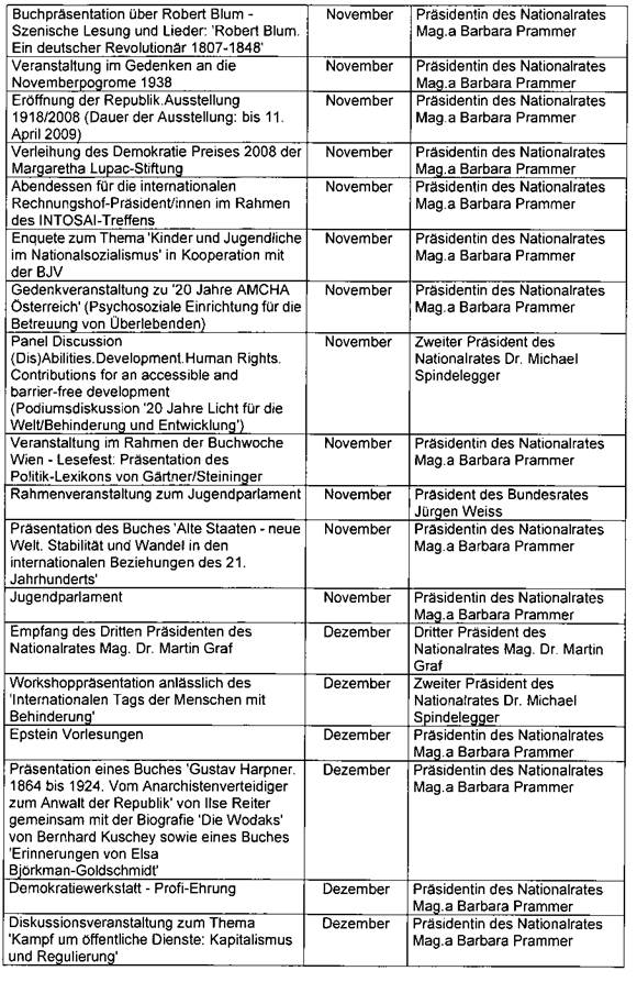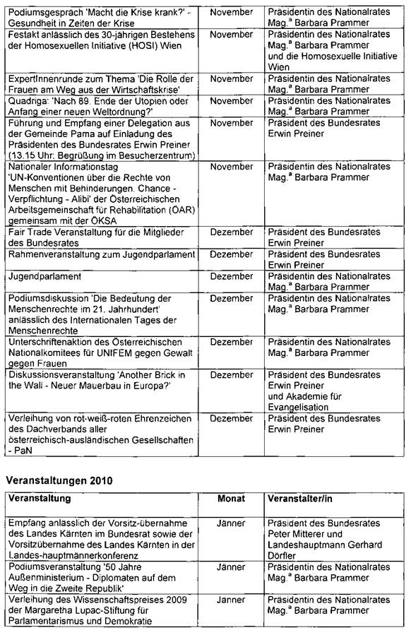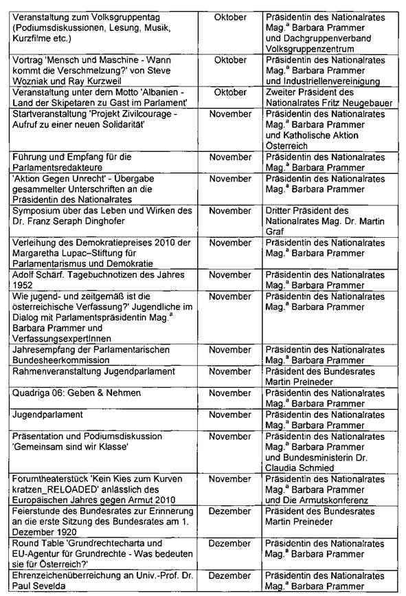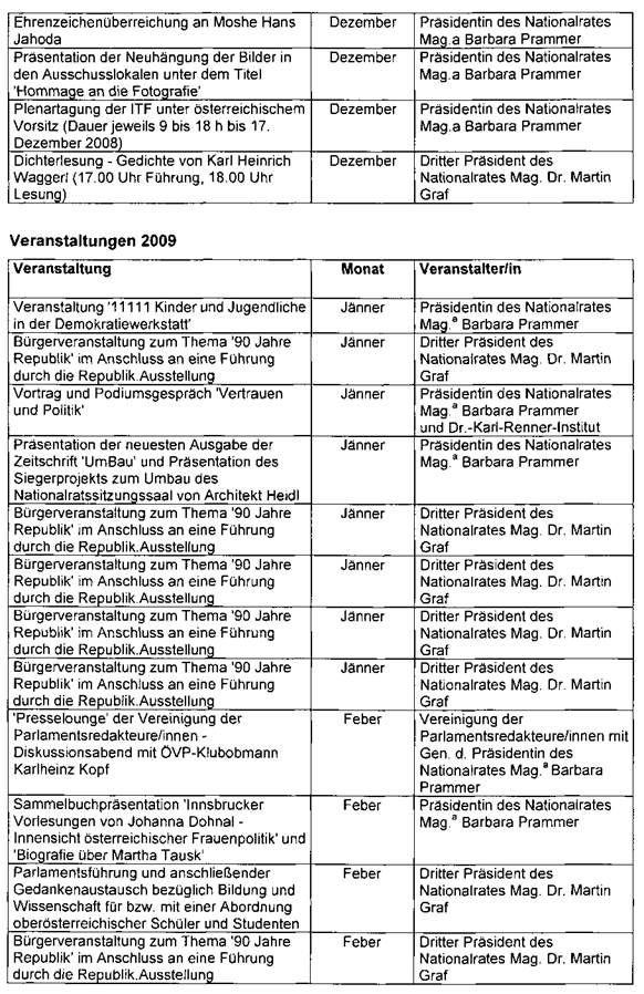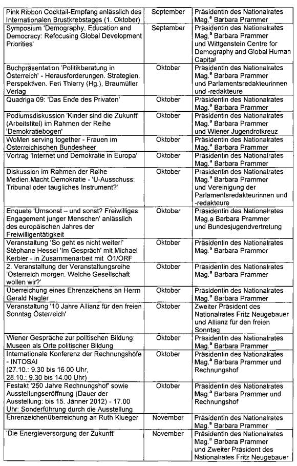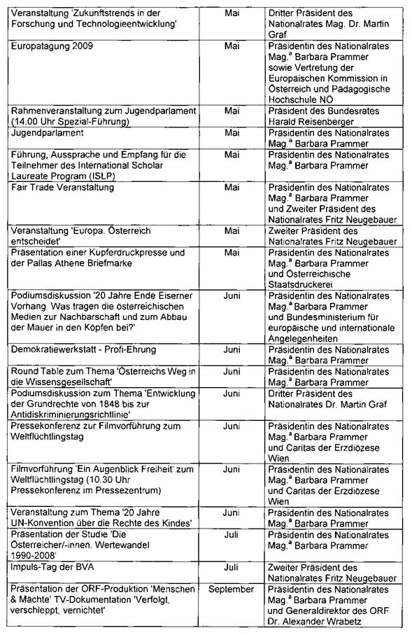 Die nachfolgende Auflistung gibt einen genauen Überblick über die Veranstaltungen der laufenden XXIV. Gesetzgebungsperiode. In der Spalte "Veranstalter/in" ist exakt angeführt, welche/r Präsident/in des Nationalrates, welcher Präsident bzw. Vizepräsident/in des Bundesrates als Gastgeber fungierten. Weiters sind der Tabelle sämtliche Kooperationspartner zu entnehmen. Ich weise an dieser Stelle darauf hin, dass diese Daten im Intranet des Parlaments abgebildet und jederzeit einsehbar sind.