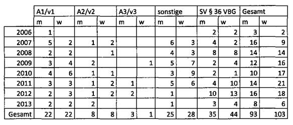 Hinsichtlich der Einstellungen von Mitarbeiterinnen und Mitarbeitern im Zeitraum vom 30. Oktober 2006 bis 31. Mai 2013 verweise ich auf die nachstehende Tabelle: