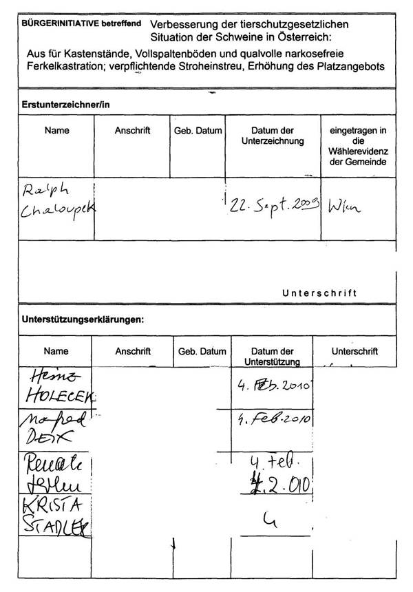 Bürgerinitiative betreffend Verbesserung der tierschutzgesetzlichen |