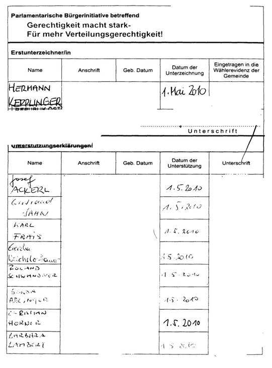 Formblatt für eine Parlamentarische Bürgerinitiative