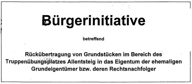 Bitte unterstützen sie die Bürgerinitiative betreffend "Rückübertragung von Grundstücken im Bereich des Truppenübungsplatzes Allentsteig in das Eigentum der ehemaligen Grundeigentümer bzw. deren Rechtsnachfolger" mit ihrer Unterschrift.