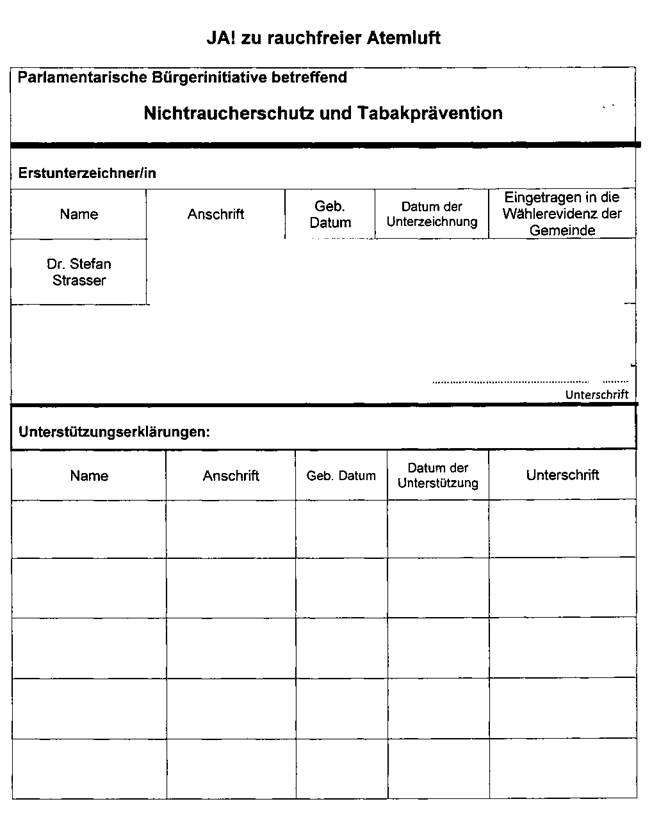 ANLIEGEN: Der Nationalrat wird ersucht, Nichtraucherschutz und Tabakprävention im Tabakgesetz neu zu regeln. Passivrauch führt zu gesundheitlichen Schäden und verursacht jährlich etwa 1000 fremdverschuldete vorzeitige Todesfälle. Für den überwiegenden Teil der Bevölkerung stellt Passivrauch zudem eine Belästigung dar und schränkt die Lebensqualität ein. Kinder und Jugendliche kommen problemlos an Zigaretten heran, nahezu