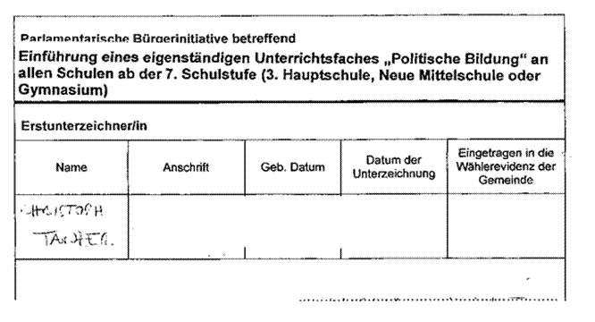 Der Nationalrat wird ersucht, die Einführung eines eigenständigen Unterrichtsfaches „Politische Bildung“ an allen Schulen ab der 7. Schulstufe (3. Hauptschule, Neue Mittelschule oder Gymnasium) zu prüfen, des Weiteren zu beschließen und im Falle dessen die Erstellung von umfassenden, zeitgerechten Lehrplänen zu veranlassen.