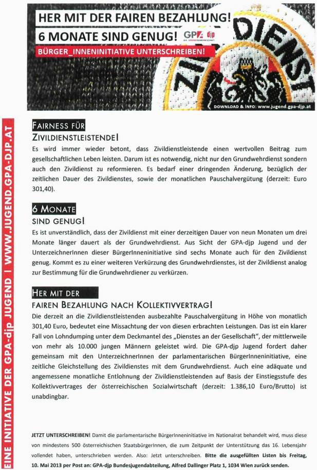 ANLIEGEN: Der Nationalrat wird ersucht, die nachstehenden Anliegen der UnterzeichnerInnen betreffend des Zivildienstes umzusetzen. die nachstehenden Anliegen der UnterzeichnerInnen hinsichtlich der Verkürzung des Zivildienstes und hinsichtlich der Entlohnung der Zivildiener umzusetzen. Es wird immer wieder betont, dass Zivildienstleistende einen wertvollen Beitrag zum gesellschaftlichen Leben leisten. Darum ist es notwendig, nicht nur den Grundwehrdienst sondern auch den Zivildienst zu reformieren. Es bedarf einer dringenden Änderung, bezüglich der zeitlichen Dauer des Zivildienstes, sowie der monatlichen Pauschalvergütung (derzeit: Euro 301,40). Es ist unverständlich, dass der Zivildienst mit einer derzeitigen Dauer von neun Monaten um drei Monate länger dauert als der Grundwehrdienst. Aus Sicht der GPA-djp Jugend und der UnterzeichnerInnen dieser BürgerInneninitiative sind sechs Monate auch für den Zivildienst genug. Kommt es zu einer weiteren Verkürzung des Grundwehrdienstes, ist der Zivildienst analog zur Bestimmung für die Grundwehrdiener zu verkürzen. Die derzeit an die Zivildienstleistenden ausbezahlte Pauschalvergütung in Höhe von monatlich 301,40 Euro, bedeutet eine Missachtung der von diesen erbrachten Leistungen. Das ist ein klarer Fall von Lohndumping unter dem Deckmantel des „Dienstes an der Gesellschaft“, der mittlerweile von mehr als 10.000 jungen Männern geleistet wird. Die GPA-djp Jugend fordert daher gemeinsam mit den UnterzeichnerInnen der parlamentarischen BürgerInneninitiative, eine zeitliche Gleichstellung des Zivildienstes mit dem Grundwehrdienst. Auch eine adäquate und angemessene monatliche Entlohnung der Zivildienstleistenden auf Basis der Einstiegsstufe des Kollektivvertrages der österreichischen Sozialwirtschaft (derzeit: 1.386,10 Euro/Brutto) ist unabdingbar. |