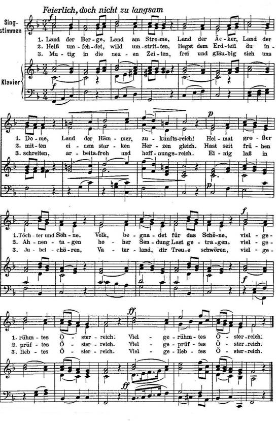§ 1. Die Bundeshymne der Republik Österreich besteht aus drei Strophen des Gedichts „Land der Berge“ und der Melodie des sogenannten Bundesliedes, beides in der Form der einen Bestandteil dieses Gesetzes bildenden Anlage.