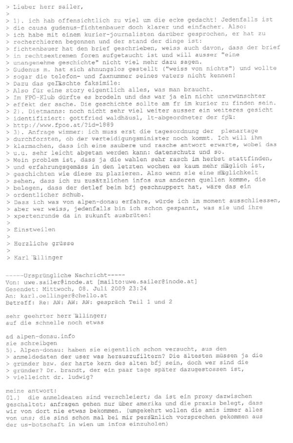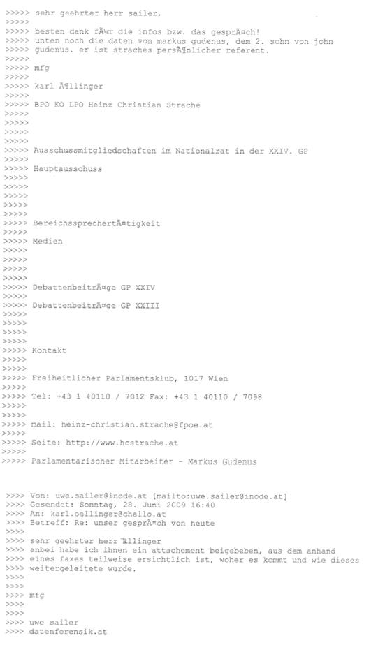 Der angeführte Mail-Verkehr des Abgeordneten Öllinger mit Herrn Uwe Sailer, seines Zeichens Kriminalbeamter, ehemaliger Gruppenführer der IT-Gruppe im Landeskriminalamt Oberösterreich und Gerichtssachverständiger für das Fachgebiet forensische Datensicherung, spiegelt die Versuche Nationalratsabgeordnete der FPÖ, wie zum Beispiel die Nationalratsabgeordneten Strache und Fichtenbauer, und deren Mitarbeiter sowie politische Funktionäre der FPÖ zu bespitzeln und auszuspionieren wider.