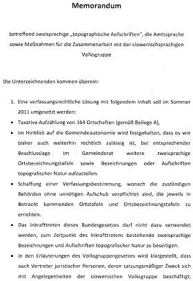 Die politische Einigung in der „Ortstafelfrage“ gemäß dem „Memorandum“ vom 26. April 2011 soll legistisch durchgeführt werden.