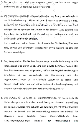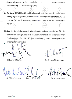 Im Auftrag von Bundeskanzler Werner Faymann hat Staatssekretär Dr. Josef Ostermayer zu diesem Zweck ausführliche Gespräche mit allen Beteiligten, nämlich den Bürgermeistern der betreffenden Gemeinden, den Heimatverbänden, den politischen Parteien und den Organisationen der Kärntner Slowenen, geführt. Gemeinsam mit Landeshauptmann Gerhard Dörfler hat Staatssekretär Dr. Josef Ostermayer mehrere Verhandlungsrunden mit den Vertreten der Kärntner Slowenen (dem Zentralverband Slowenischer Organisationen unter der Leitung von Dr. Marjan Sturm, dem Rat der Kärntner Slowenen unter der Leitung von Dr. Valentin Inzko und der Gemeinschaft der Kärntner Slowenen und Sloweninnen unter der Leitung von Bernard Sadovnik) und mit den Bürgermeistern der betroffenen Gemeinden geführt.