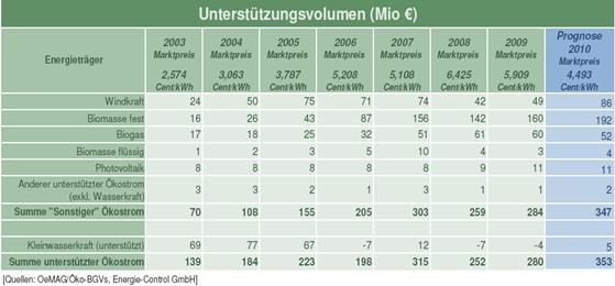 Durch die auf Grund des Ökostromgesetzes erfolgte, forcierte Förderung der Stromerzeugung aus erneuerbaren Energieträgern wurde das ursprünglich für das Jahr 2008 festgeschriebene Ziel eines Anteils der sonstigen erneuerbaren Energieträger von 4%, gemessen an der jährlichen Stromabgabe an Endverbraucher, bereits im Jahr 2005 erreicht.