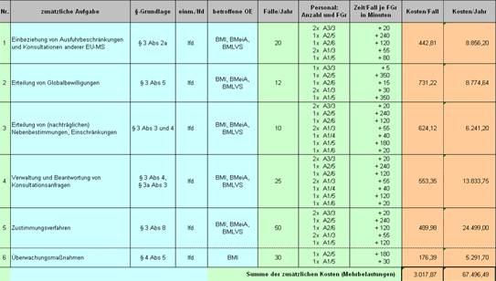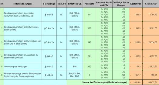 Die im Entwurf enthaltenen neuen Informationsverpflichtungen und vorgesehenen Änderungen (Entfall) bestehender Informationsverpflichtungen werden bei Unternehmen, die Kriegsmaterial innerhalb der Europäischen Union ein-, aus- oder durchführen, zu zusätzlichen Kosten in der Höhe von ~4.000 Euro, Minderausgaben von ~66.500 Euro und Minderbelastungen von ~23.000 Euro, im Ergebnis damit zu einer Verminderung der Verwaltungskosten um ~85.500 Euro pro Jahr führen.