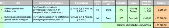 Zu den Auswirkungen des Vorhabens auf die Verwaltungskosten für Unternehmen wird auf die Ausführungen im Vorblatt, auf die oben bei lit. a, zweiter Spiegelstrich, erfolgte Darstellung der entfallenden Gebühren und Bundesverwaltungsabgaben (Minderausgaben von ~66.500 Euro) sowie auf die Anlagen 1 und 2 (zusätzliche Kosten von ~4.000 Euro und Minderbelastungen von ~23.000 Euro) verwiesen. Es ist demnach von einer Verminderung der Verwaltungskosten für Unternehmen von ~85.500 Euro pro Jahr auszugehen.