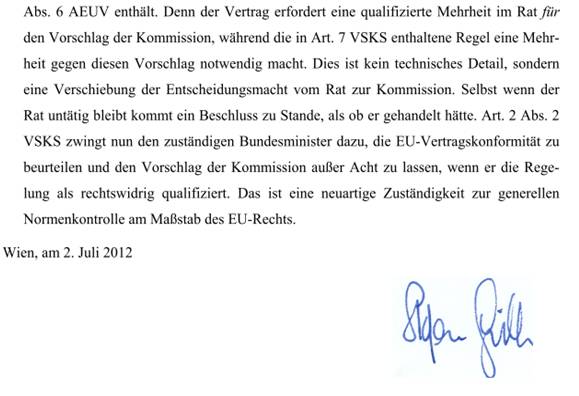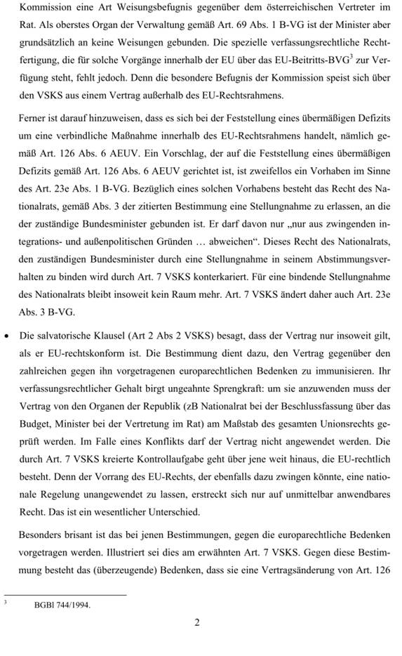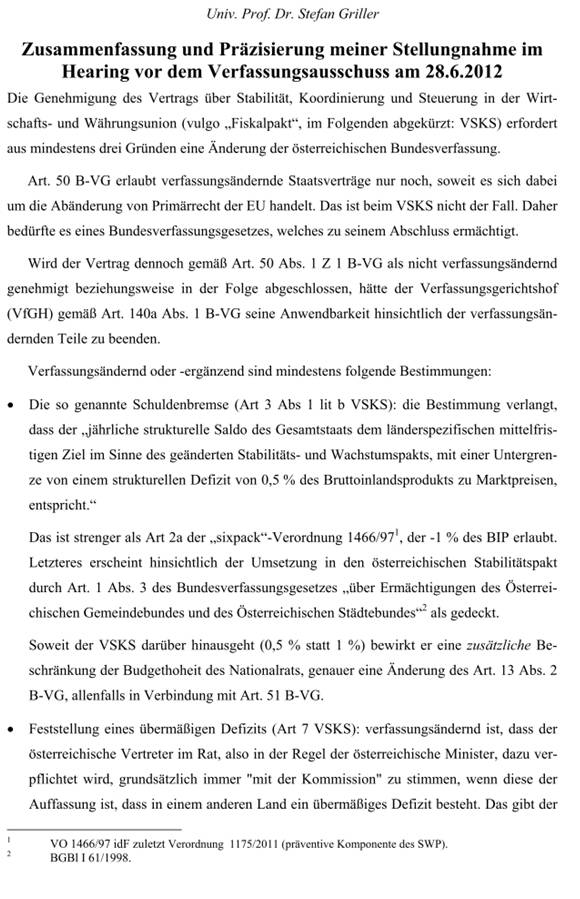 Drittens enthält der Fiskalpakt eine Reihe von Bestimmungen, die mit der österreichischen Verfassung nicht im Einklang stehen. Daher hätte vor der Ratifizierung des Fiskalpaktes eine entsprechende Verfassungsnovelle oder ein Bundesverfassungsgesetz, welches zu seinem Abschluss ermächtigt (beides mit 2/3-Mehrheit) beschlossen werden müssen. Zu den verfassungsrechtlichen Einwänden siehe im Detail Stefan Griller, Zusammenfassung und Präzisierung meiner Stellungnahme im Hearing vor dem Verfassungsausschuss am 28. 6. 2012 am Ende dieses Minderheitsberichts. Die Grünen werden daher dem Fiskalpakt und seiner Ratifikation im Nationalrat die Zustimmung verweigern und eine Anfechtung beim Verfassungsgerichtshof anstreben, der die Verfassungskonformität dieses Vertrages prüfen soll.