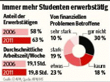 Dabei verfügte 2011 der Durchschnittsstudent über ein Budget von monatlich 1004 Euro. Das entspricht einem realen Minus von zwei Prozent gegenüber der letzten direkt vergleichbaren Erhebung 2009 (968 Euro). Demgegenüber sind die Ausgaben der Studenten seit 2009 um drei Prozent gestiegen. Monatlich gibt jeder Student durchschnittlich 930 Euro aus. Überdurchschnittlich stark angewachsen sind die Kosten für Wohnen und für Ernährung. 29 Prozent der Studenten gaben an, sehr starke oder starke finanzielle Schwierigkeiten zu haben. Die alle zwei Jahre stattfindende Umfrage unter Studierenden zeigte außerdem, dass immer weniger Studenten aus niedrigen sozialen Schichten kommen. So sank der Anteil dieser Studenten an Unis und Fachhochschulen zwischen 1998 und 2011 von 26 auf 18 Prozent….‘