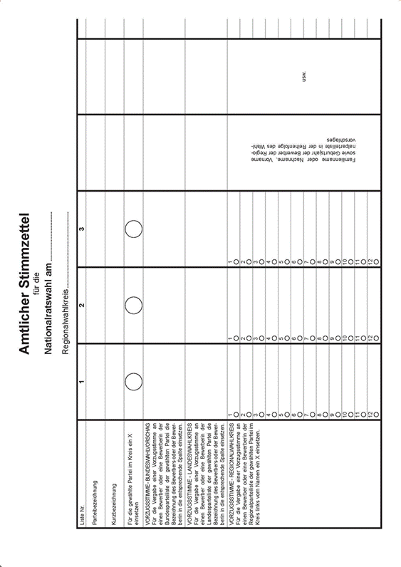 „Bei jenen wahlwerbenden Parteien, für die die Bundeswahlbehörde keinen Bundeswahlvorschlag veröffentlicht hat, ist das für die Vergabe von Vorzugsstimmen für die Bundesparteiliste vorgesehene Feld mit einer Schraffierung zu versehen.“
