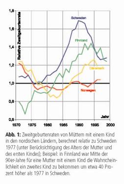 „Schweden führte in den 1980er-Jahren eine geburtenbezogene Elterngeldregelung ein: Eltern, die ihr zweites (oder weiteres) Kind innerhalb eines bestimmten Zeitraumes nach dem vorangegangenen Kind bekommen, können Elterngeld auf der Basis jenes Einkommens erhalten, das sie vor der Geburt des vorangegangenen Kindes hatten. Eine Verringerung des Einkommens, etwa durch Elternzeit oder Teilzeitbeschäftigung nach der Geburt eines Kindes, wirkt sich dann nicht auf die Höhe des Elterngeldes bei einer folgenden Geburt aus. Diese Maßnahme hat zu einer Verkürzung des Geburtenabstandes insbesondere zwischen dem ersten und zweiten Kind geführt. Dies bewirkte einen Anstieg der Zweitgeburtenraten (siehe Abbildung 1) und zu einem geringeren Teil der Dritt- und Viertgeburtenraten.