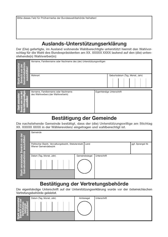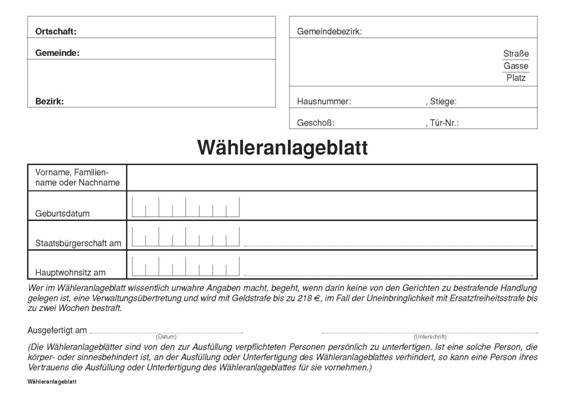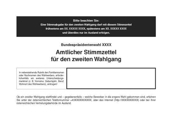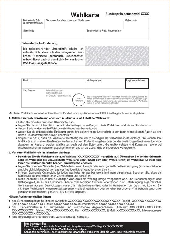 „Hierzu hat der Wähler den von ihm ausgefüllten amtlichen Stimmzettel in das beige-farbene Wahlkuvert zu legen, dieses zu verschließen und in die Wahlkarte zu legen, sodann auf der Wahlkarte durch eigenhändige Unterschrift eidesstattlich zu erklären, dass er den amtlichen Stimmzettel persönlich, unbeobachtet, unbeeinflusst und vor Schließen des letzten österreichischen Wahllokals ausgefüllt hat, anschließend die Wahlkarte zu verschließen und so rechtzeitig an die Bezirkswahlbehörde zu übermitteln, dass die Wahlkarte dort spätestens am achten Tag nach dem Wahltag bis 14.00 Uhr einlangt.“