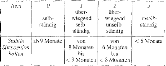 Wie in der Erwachsenenbegutachtung erfolgt die Bewertung der Selbständigkeit bei Kindern anhand der vierstufigen Skala mit den Ausprägungen "selbständig", "überwiegend selbständig", "überwiegend unselbständig" und "unselbständig". Dementsprechend musste für jedes Item des Erhebungsbogens für die Bewertungssystematik festgelegt werden, in welchem Alter diese Stufen der Selbständigkeit erreicht werden. Die Festlegung erfolgte anhand einer dreischrittigen Vorgehensweise: Zunächst wurde der "normale" kindliche Entwicklungsverlauf herausgearbeitet und in einem zweiten Schritt im Hinblick auf markante Entwicklungsschritte mit ihrer jeweiligen Altersstufe überprüft. Anschließend erfolgte die Zuordnung dieser Altersstufen zu den vier Ausprägungsmerkmalen. Am Beispiel des Items "Stabile Sitzposition halten" soll dieses Verfahren verdeutlicht werden. Für das Item stellt sich der Entwicklungsverlauf folgendermaßen dar: Als Voraussetzung für stabiles Sitzen muss zunächst die Fähigkeit zur kontinuierlichen Aufrechterhaltung des Kopfes vorhanden sein (erste Entwicklungsstufe). Später sitzt das Kind, indem es von einer Pflegeperson gestützt oder gehalten wird (zweite Entwicklungsstufe). Im nächsten Schritt sitzt das Kind schon relativ stabil, indem es sich selbst abstützt (dritte Entwicklungsstufe). Die Fähigkeit ist voll entwickelt, wenn das Kind sich ohne Hilfe aufsetzen kann und selbständig mit stabiler Kopf und Rumpfkontrolle sitzt (vierte Entwicklungsstufe).