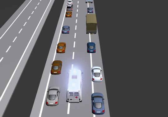 - die Fahrzeuge nutzen für die Bildung der Rettungsgasse den gesamten befestigten und befahrbaren Bereich der Straße. D. h. bei einem vorhandenen Pannenstreifen wird auch diese Fläche von der rechten Fahrzeugkolonne genutzt und die Breite der Rettungsgasse maximiert.