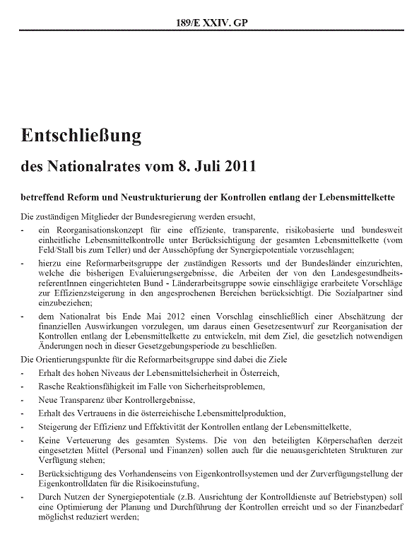 Entschließung 189/E XXIV.GP des Nationalrates vom 8. Juli 2011 betreffend Reform und Neustrukturierung der Kontrollen entlang der Lebensmittelkette
