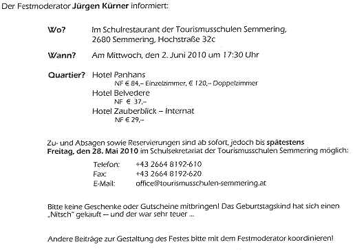 In der Woche vor dem Geburtstagsfest ist der Fachvorstand der Tourismusschule Semmering plötzlich verstorben, die Feier wurde daher aus Pietätsgründen in das danebenliegende Hotel Panhans verlegt, aber von der Schule weiterhin ausgerichtet.