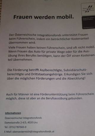 Laut einem Schreiben des Österreichischen Integrationsfonds werden für asylberechtigte, Subsidiär Schutzberechtigte, und Drittstaatsangehörige die Kosten für den Führerschein übernommen.