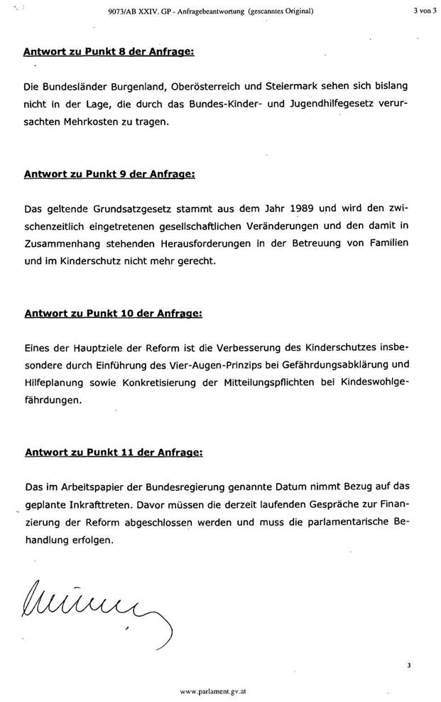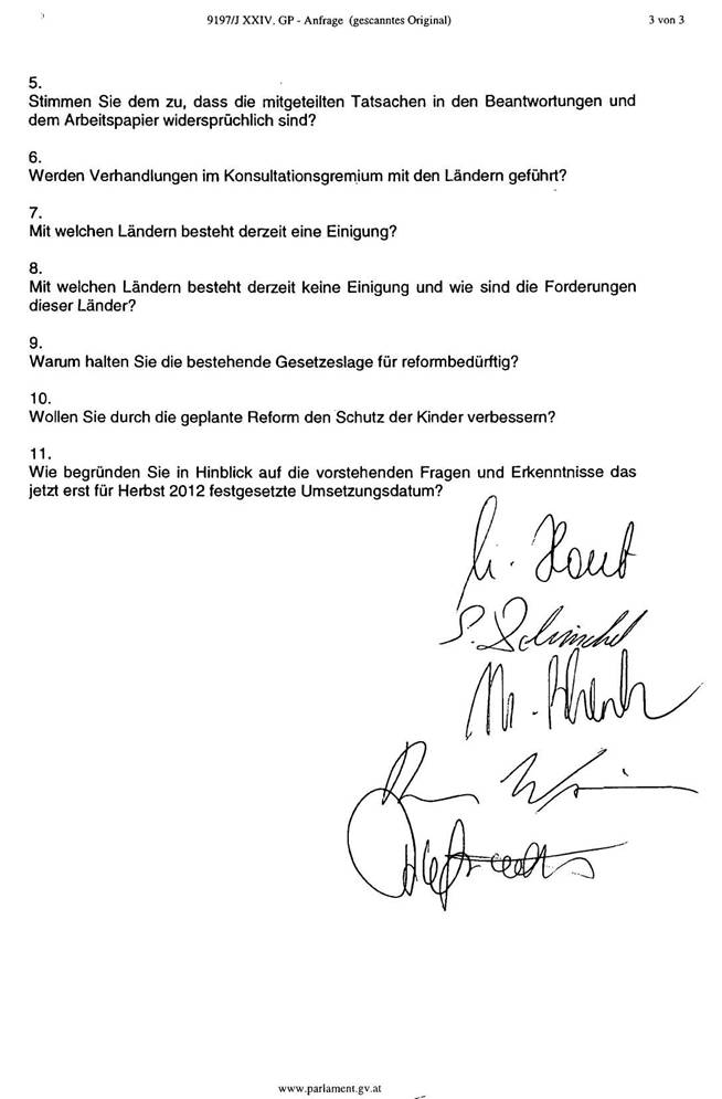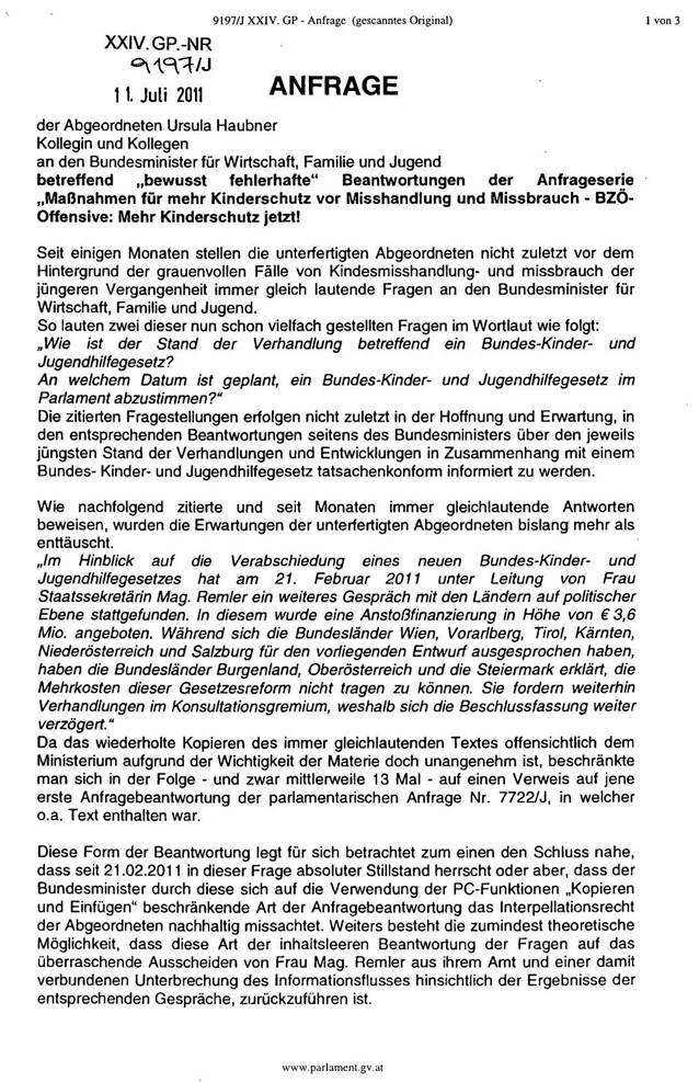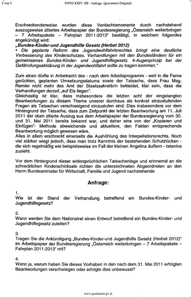 Erinnernd an die schrecklichen Kinderschicksale ermahnen wir heute und solange, bis ausreichend Lehren aus den Fällen gezogen und entsprechende Maßnahmen zum Schutz unserer Kinder vor Missbrauch und Misshandlung getätigt werden. In diesem Zusammenhang richten die unterzeichneten Abgeordneten an den Herrn Bundesminister für Wirtschaft, Familie und Jugend nachstehende