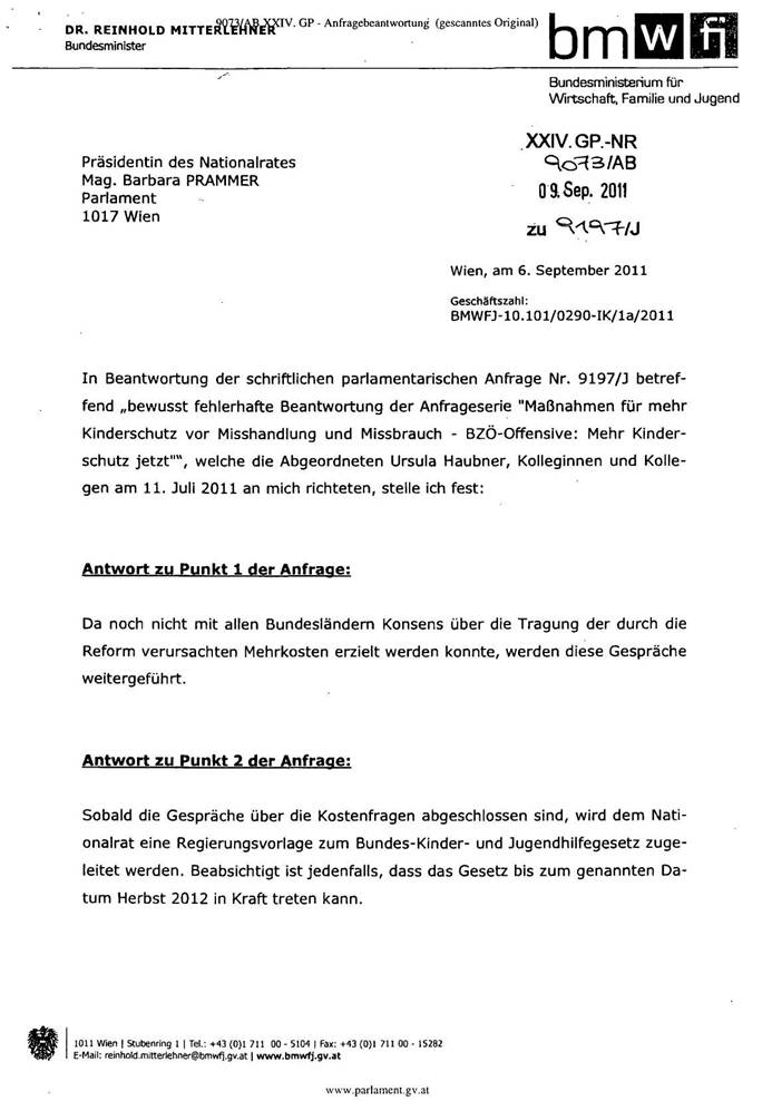 Wann werden Sie dem Nationalrat einen Entwurf betreffend ein Bundes-Kinder- und Jugendhilfegesetz, welches nach Ihrer Aussage im Herbst 2012 in Kraft treten soll, zuleiten?