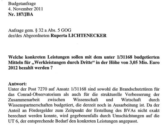 In einer der kurzen schriftlichen Anfragen zum Budget nach Untergliederung im November 2011 haben wir nach den „Werkleistungen durch Dritte“ gefragt, die Antwort war wenig aussagekräftig: