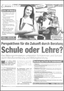 Am Dienstag, 28. 2. findet sich in der Zeitung "Heute" in der Beilage "FOKUS Heute" ein ganzseitiges Inserat des BMUKK mit dem Titel "Schule oder Lehre?". ("FOKUS Heute", 28. 2. 2012, S. 14)