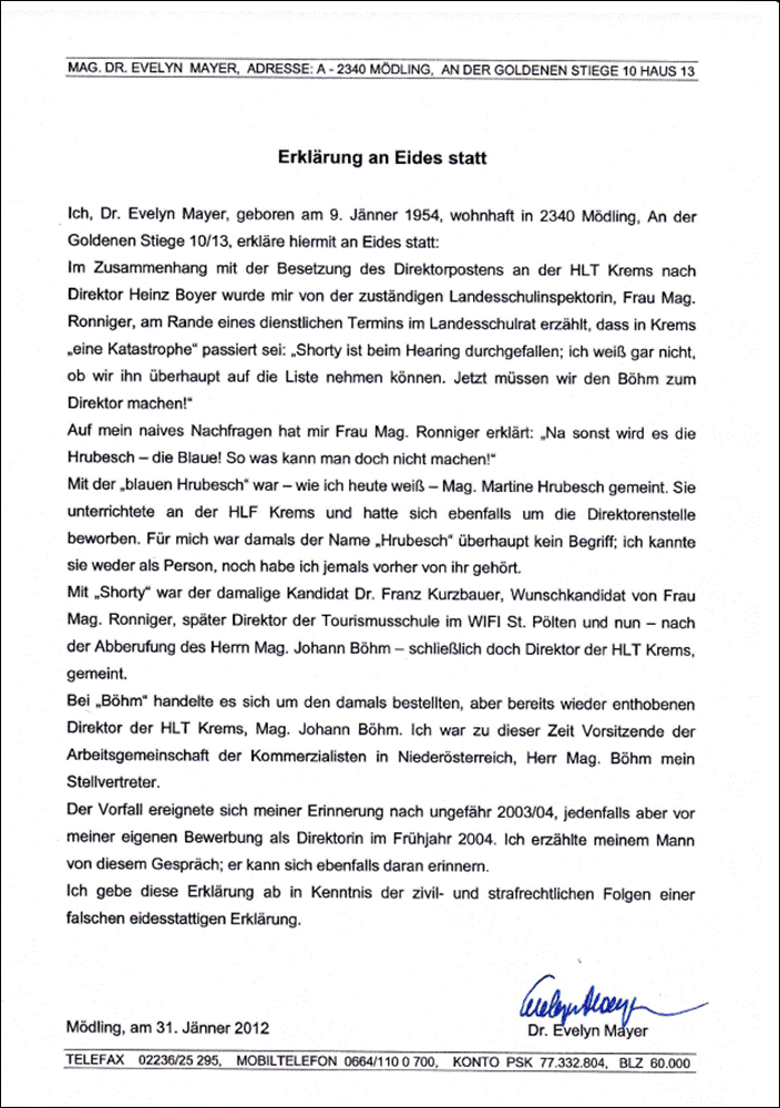 Dr. Evelyn Mayer hat zudem eine Eidesstattliche Erklärung (s. Anhang)