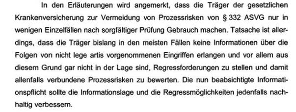 In den Erläuterungen zu § 10 des Ministerialentwurfs für ein ÄsthOp-Gesetz wird betreffend Anwendung des § 332 ASVG ausgeführt: „Wenngleich erfahrungsgemäß schon zur Vermeidung von Prozessrisken die Träger der gesetzlichen Krankenversicherung von § 332 ASVG nur in wenigen Einzelfällen nach sorgfältiger Prüfung Gebrauch machen, so ist der in Aussicht genommene § 10, der an die bestehende Rechtslage anknüpft, gleichsam als Beitrag zur Qualitätssicherung zu sehen.“
