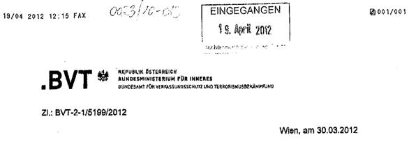 Dem BVT war zum Zeitpunkt der Anfragebeantwortung auch bekannt, dass das Verfahren gegen Michael R. eingestellt ist. Mit Schreiben vom 30.3.2012, siehe nachstehendes Faksimile, wurde dem Anwalt von Michael R. seitens des BVT mitgeteilt, dass eine Akteneinsicht in die Polizeiakten nicht möglich sei, weil die Staatsanwaltschaft das Verfahren bereits eingestellt habe.