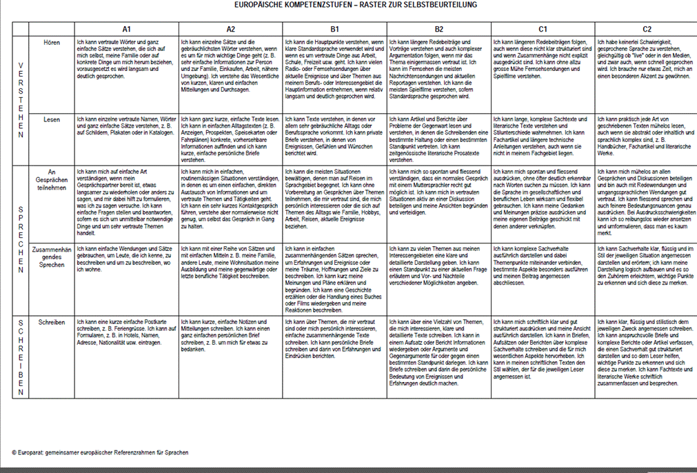 Eine weit verbreitete Kategorisierung von Sprachkenntnissen bietet etwa der „Gemeinsame europäische Referenzrahmen für Sprachen“, wie auf der folgenden Seite abgebildet: