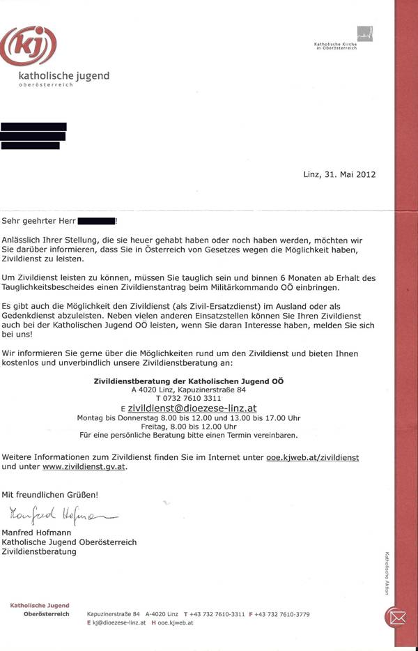 Wie dem beiliegenden und anonymisierten Schreiben der Katholischen Jugend entnommen werden kann, wendet sich diese an Stellungspflichtige offensichtlich auch schon vor deren Stellung und lädt diese zur Absolvierung des Zivildienstes – auch bei der KJ – ein. Dies ist umso bemerkenswerter, als § 57a Zivildienstgesetz ausdrücklich regelt, dass Daten von „Zivildienstwerbern“ und „Zivildienstpflichtigen“ nur unter ganz bestimmten Voraussetzungen an die Rechtsträger des Zivildienstes zur Erfüllung deren gesetzlicher Pflichten überlassen bzw. übermitteln werden dürfen. Im gegenständlichen Fall kann dies nicht zutreffen, da der Betroffene weder Zivildienstwerber noch Zivildienstpflichtiger war. Darüber hinaus regelt § 5 ZivDG ausdrücklich, dass die Stellungspflichtigen anlässlich der Stellung von der Möglichkeit zur Absolvierung des Zivildienstes zu informieren sind.