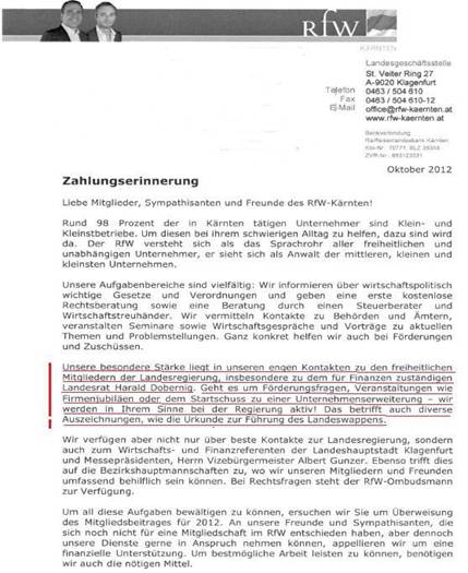 Wie aus der hervorgehobenen Stelle erkennbar ist, bietet darin der Ring freiheitlicher Wirtschaftstreibender seinen „Mitgliedern, Sympathisanten und Freunden“ enge Kontakte zu den freiheitlichen Mitgliedern der Landesregierung, insbesondere zu dem für Finanzen zuständigen Landesrat Harald Dobernig an. Weiters werde der RfW in Förderungsfragen, Veranstaltungen wie Firmenjubiläen oder dem Startschuss zu einer Unternehmenserweiterung im Sinne der Mitglieder bei der Regierung aktiv. Das betreffe auch diverse Auszeichnungen wie die Urkunde zur Führung des Landeswappens. Weiters geworben mit besten Kontakten zum Wirtschafts- und Finanzreferenten der Landeshauptstadt Klagenfurt und Messepräsidenten, Vizebürgermeister Albert GUNZER. Das treffe auch auf Bezirkshauptmannschaften zu.