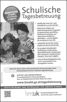 In der Tageszeitung „Kurier“ vom 1. Dezember 2012 ist auf Seite 4 ein Inserat des BMUKK mit dem Titel „Schulische Tagesbetreuung“ zu finden.