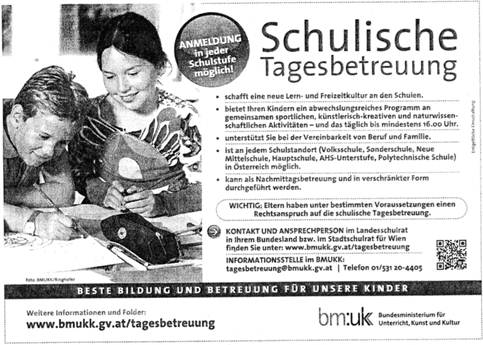 In der Tageszeitung „Österreich“ vom 10. Dezember 2012 ist auf Seite 34 ein Inserat des BMUKK mit dem Titel „Schulische Tagesbetreuung“ zu finden.
