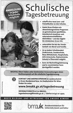 In der Tageszeitung „Presse“ vom 14. Dezember 2012 ist auf Seite 13 ein Inserat des BMUKK mit dem Titel „Schulische Tagesbetreuung“ zu finden.