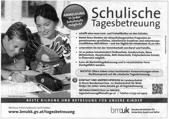In der Tageszeitung „Österreich“ vom 14. Jänner 2013 ist auf Seite 38 ein Inserat des BMUKK mit dem Titel „Schulische Tagesbetreuung“ zu finden.