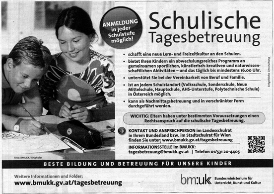 In der Tageszeitung „Österreich“ vom 18. Jänner 2013 ist auf Seite 32 ein Inserat des BMUKK mit dem Titel „Schulische Tagesbetreuung“ zu finden.